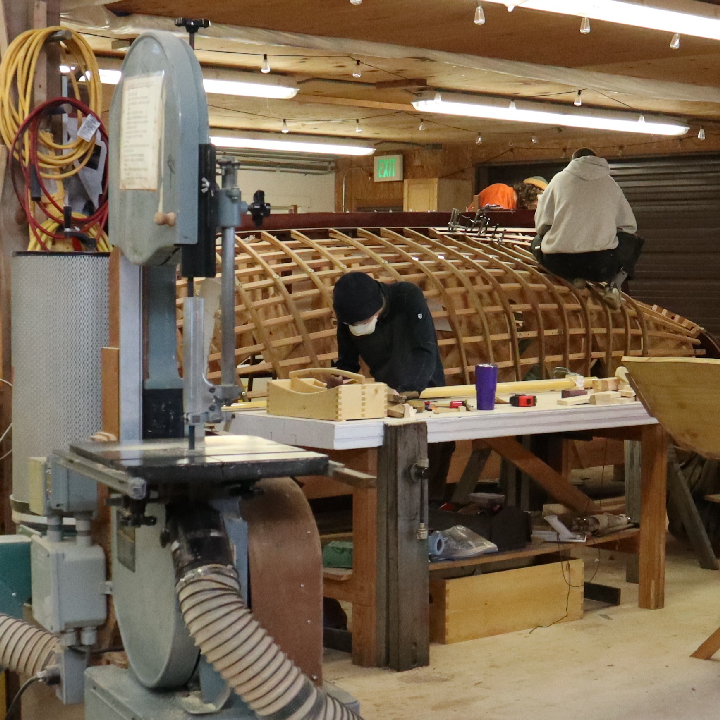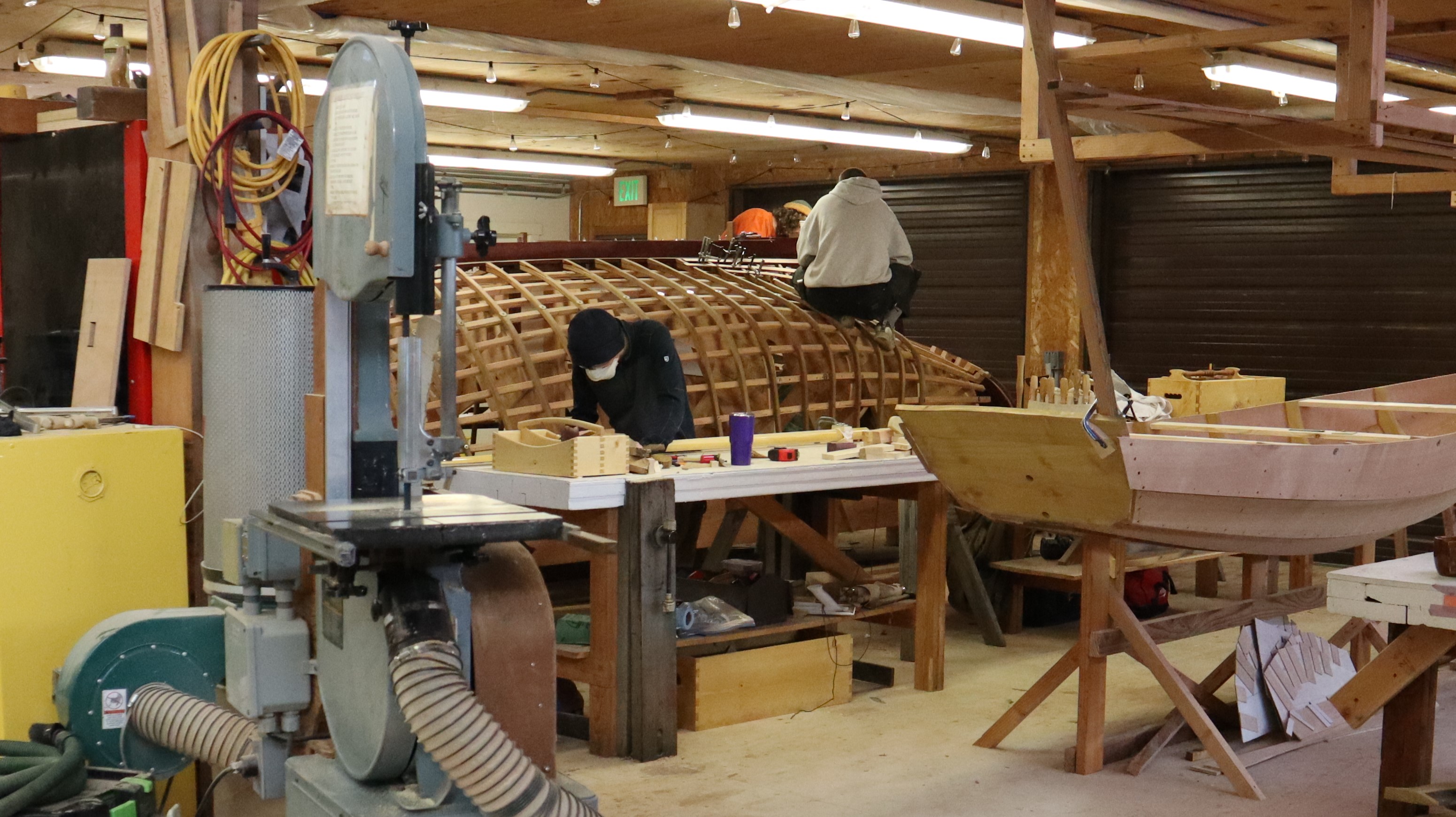 Students at the Northwest School of Wooden Boatbuilding work on their project during a site visit for a Partner Profile.